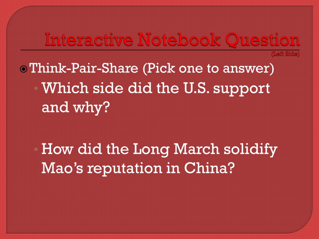 Interactive Notebook Question (Left Side) • Think-Pair-Share (Pick one to answer) • Which side did the U.S. support and why? • How did the Long March solidify Mao’s reputation in China?