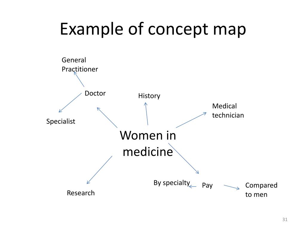 Example of concept map General Practitioner Doctor History Medical technician Specialist Women in medicine By specialty Pay Compared to men Research