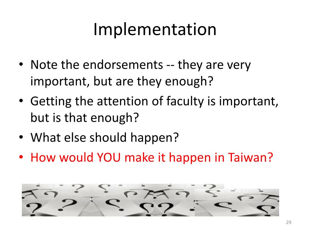 Implementation • Note the endorsements -- they are very important, but are they enough? • Getting the attention of faculty is important, but is that enough? • What else should happen? • How would YOU make it happen in Taiwan?
