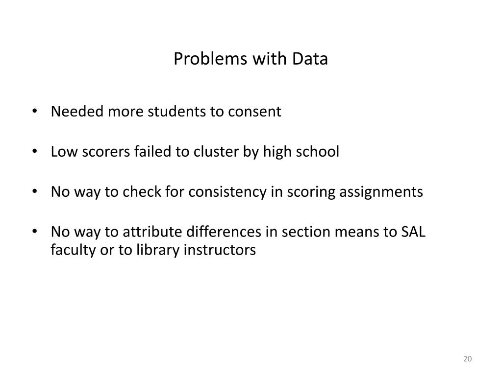 Needed more students to consent Low scorers failed to cluster by high school No way to check for consistency in scoring assignments No way to attribute differences in section means to SAL faculty or to library instructors Problems with Data
