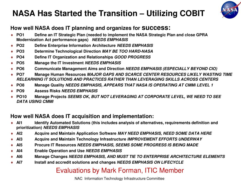 NASA Has Started the Transition – Utilizing COBIT Evaluations by Mark Forman, ITIC Member How well NASA does IT planning and organizes for success: PO1 Define an IT Strategic Plan (needed to implement the NASA Strategic Plan and close GPRA Modernization Act performance gaps) NEEDS EMPHASIS PO2 Define Enterprise Information Architecture NEEDS EMPHASIS PO3 Determine Technological Direction MAY BE TOO HARD-NASA PO4 Define IT Organization and Relationships GOOD PROGRESS PO5 Manage the IT Investment NEEDS EMPHASIS PO6 Communicate Management Aims and Direction NEEDS EMPHASIS (ESPECIALLY BEYOND CIO) PO7 Manage Human Resources MAJOR GAPS AND SCARCE CENTER RESOURCES LIKELY WASTING TIME RELEARNING IT SOLUTIONS AND PRACTICES RATHER THAN LEVERAGING SKILLS ACROSS CENTERS PO8 Manage Quality NEEDS EMPHASIS, APPEARS THAT NASA IS OPERATING AT CMMi LEVEL 1 PO9 Assess Risks NEEDS EMPHASIS PO10 Manage Projects SEEMS OK, BUT NOT LEVERAGING AT CORPORATE LEVEL, WE NEED TO SEE DATA USING CMMI How well NASA does IT acquisition and implementation: AI1 Identify Automated Solutions (this includes analysis of alternatives, requirements definition and prioritization) NEEDS EMPHASIS AI2 Acquire and Maintain Application Software MAY NEED EMPHASIS, NEED SOME DATA HERE AI3 Acquire and Maintain Technology Infrastructure IMPROVEMENT EFFORTS UNDERWAY AI5 Procure IT Resources NEEDS EMPHASIS, SEEMS SOME PROGRESS IS BEING MADE AI4 Enable Operation and Use NEEDS EMPHASIS AI6 Manage Changes NEEDS EMPHASIS, AND MUST TIE TO ENTERPRISE ARCHITECTURE ELEMENTS AI7 Install and accredit solutions and changes NEEDS EMPHASIS ON LIFECYCLE NAC Information Technology Infrastructure Committee