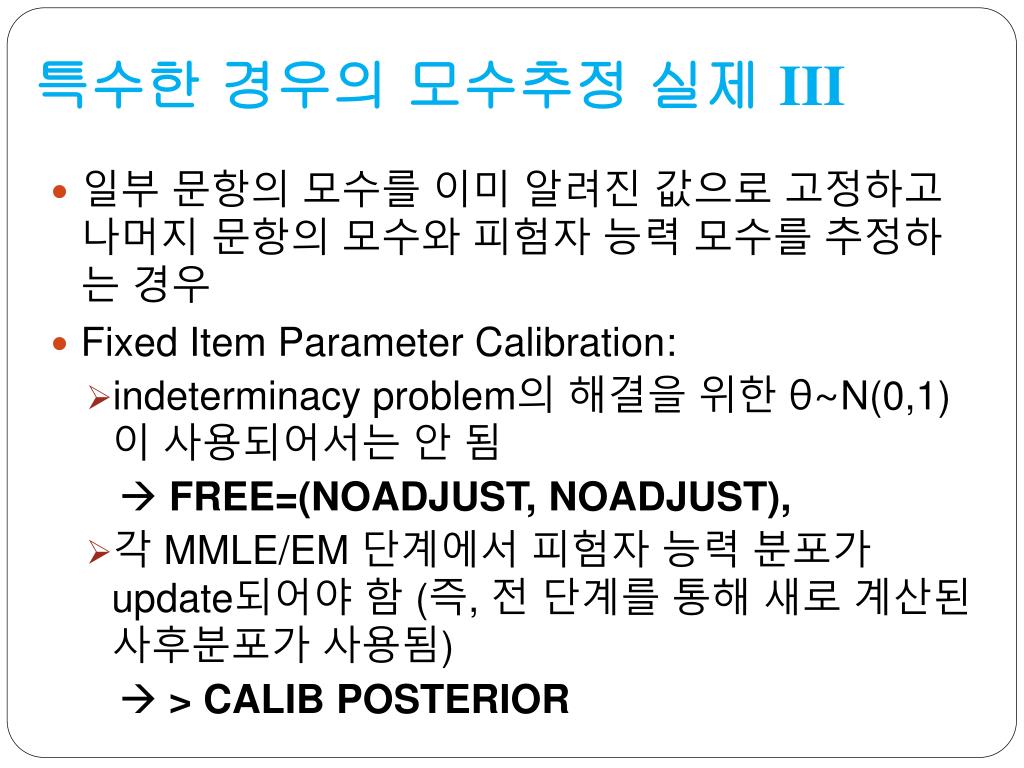특수한 경우의 모수추정 실제 III • 일부 문항의 모수를 이미 알려진 값으로 고정하고 나머지 문항의 모수와 피험자 능력 모수를 추정하는 경우 • Fixed Item Parameter Calibration: • indeterminacy problem의 해결을 위한 θ~N(0,1)이 사용되어서는 안 됨 FREE=(NOADJUST, NOADJUST), • 각 MMLE/EM 단계에서 피험자 능력 분포가 update되어야 함 (즉, 전 단계를 통해 새로 계산된 사후분포가 사용됨) > CALIB POSTERIOR