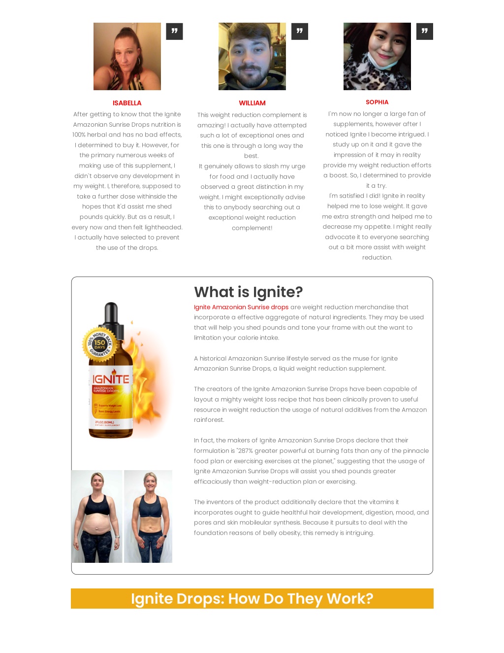 ” ” ” SOPHIA ISABELLA WILLIAM I`m now no longer a large fan of supplements, however after I noticed Ignite I become intrigued. I study up on it and it gave the impression of it may in reality provide my weight reduction efforts a boost. So, I determined to provide it a try. I'm satisfied I did! Ignite in reality helped me to lose weight. It gave me extra strength and helped me to decrease my appetite. I might really advocate it to everyone searching out a bit more assist with weight reduction. After getting to know that the Ignite Amazonian Sunrise Drops nutrition is 100% herbal and has no bad effects, I determined to buy it. However, for the primary numerous weeks of making use of this supplement, I didn`t observe any development in my weight. I, therefore, supposed to take a further dose withinside the hopes that it'd assist me shed pounds quickly. But as a result, I every now and then felt lightheaded. I actually have selected to prevent the use of the drops. This weight reduction complement is amazing! I actually have attempted such a lot of exceptional ones and this one is through a long way the best. It genuinely allows to slash my urge for food and I actually have observed a great distinction in my weight. I might exceptionally advise this to anybody searching out a exceptional weight reduction complement! What is Ignite? Ignite Amazonian Sunrise drops are weight reduction merchandise that incorporate a effective aggregate of natural ingredients. They may be used that will help you shed pounds and tone your frame with out the want to limitation your calorie intake. A historical Amazonian Sunrise lifestyle served as the muse for Ignite Amazonian Sunrise Drops, a liquid weight reduction supplement. The creators of the Ignite Amazonian Sunrise Drops have been capable of layout a mighty weight loss recipe that has been clinically proven to useful resource in weight reduction the usage of natural additives from the Amazon rainforest. In fact, the makers of Ignite Amazonian Sunrise Drops declare that their formulation is "287% greater powerful at burning fats than any of the pinnacle food plan or exercising exercises at the planet," suggesting that the usage of Ignite Amazonian Sunrise Drops will assist you shed pounds greater efficaciously than weight-reduction plan or exercising. The inventors of the product additionally declare that the vitamins it incorporates ought to guide healthful hair development, digestion, mood, and pores and skin mobileular synthesis. Because it pursuits to deal with the foundation reasons of belly obesity, this remedy is intriguing. Ignite Drops: How Do They Work?