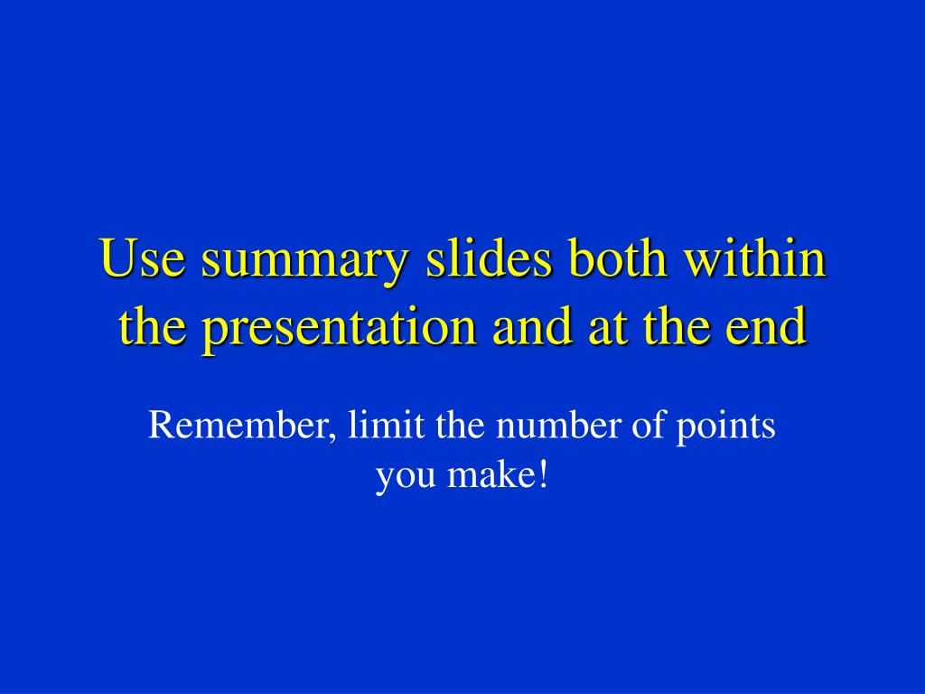 Use summary slides both within the presentation and at the end Remember, limit the number of points you make!