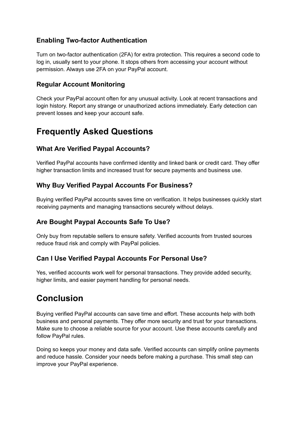 Enabling Two-factor Authentication Turn on two-factor authentication (2FA) for extra protection. This requires a second code to log in, usually sent to your phone. It stops others from accessing your account without permission. Always use 2FA on your PayPal account. Regular Account Monitoring Check your PayPal account often for any unusual activity. Look at recent transactions and login history. Report any strange or unauthorized actions immediately. Early detection can prevent losses and keep your account safe. Frequently Asked Questions What Are Verified Paypal Accounts? Verified PayPal accounts have confirmed identity and linked bank or credit card. They offer higher transaction limits and increased trust for secure payments and business use. Why Buy Verified Paypal Accounts For Business? Buying verified PayPal accounts saves time on verification. It helps businesses quickly start receiving payments and managing transactions securely without delays. Are Bought Paypal Accounts Safe To Use? Only buy from reputable sellers to ensure safety. Verified accounts from trusted sources reduce fraud risk and comply with PayPal policies. Can I Use Verified Paypal Accounts For Personal Use? Yes, verified accounts work well for personal transactions. They provide added security, higher limits, and easier payment handling for personal needs. Conclusion Buying verified PayPal accounts can save time and effort. These accounts help with both business and personal payments. They offer more security and trust for your transactions. Make sure to choose a reliable source for your account. Use these accounts carefully and follow PayPal rules. Doing so keeps your money and data safe. Verified accounts can simplify online payments and reduce hassle. Consider your needs before making a purchase. This small step can improve your PayPal experience.