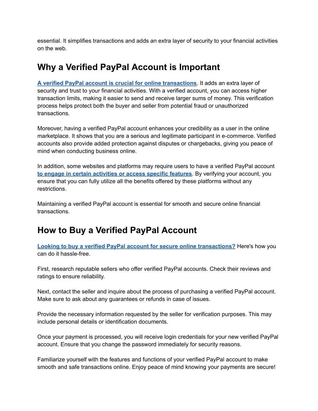 essential. It simplifies transactions and adds an extra layer of security to your financial activities on the web. Why a Verified PayPal Account is Important A verified PayPal account is crucial for online transactions. It adds an extra layer of security and trust to your financial activities. With a verified account, you can access higher transaction limits, making it easier to send and receive larger sums of money. This verification process helps protect both the buyer and seller from potential fraud or unauthorized transactions. Moreover, having a verified PayPal account enhances your credibility as a user in the online marketplace. It shows that you are a serious and legitimate participant in e-commerce. Verified accounts also provide added protection against disputes or chargebacks, giving you peace of mind when conducting business online. In addition, some websites and platforms may require users to have a verified PayPal account to engage in certain activities or access specific features. By verifying your account, you ensure that you can fully utilize all the benefits offered by these platforms without any restrictions. Maintaining a verified PayPal account is essential for smooth and secure online financial transactions. How to Buy a Verified PayPal Account Looking to buy a verified PayPal account for secure online transactions? Here's how you can do it hassle-free. First, research reputable sellers who offer verified PayPal accounts. Check their reviews and ratings to ensure reliability. Next, contact the seller and inquire about the process of purchasing a verified PayPal account. Make sure to ask about any guarantees or refunds in case of issues. Provide the necessary information requested by the seller for verification purposes. This may include personal details or identification documents. Once your payment is processed, you will receive login credentials for your new verified PayPal account. Ensure that you change the password immediately for security reasons. Familiarize yourself with the features and functions of your verified PayPal account to make smooth and safe transactions online. Enjoy peace of mind knowing your payments are secure!