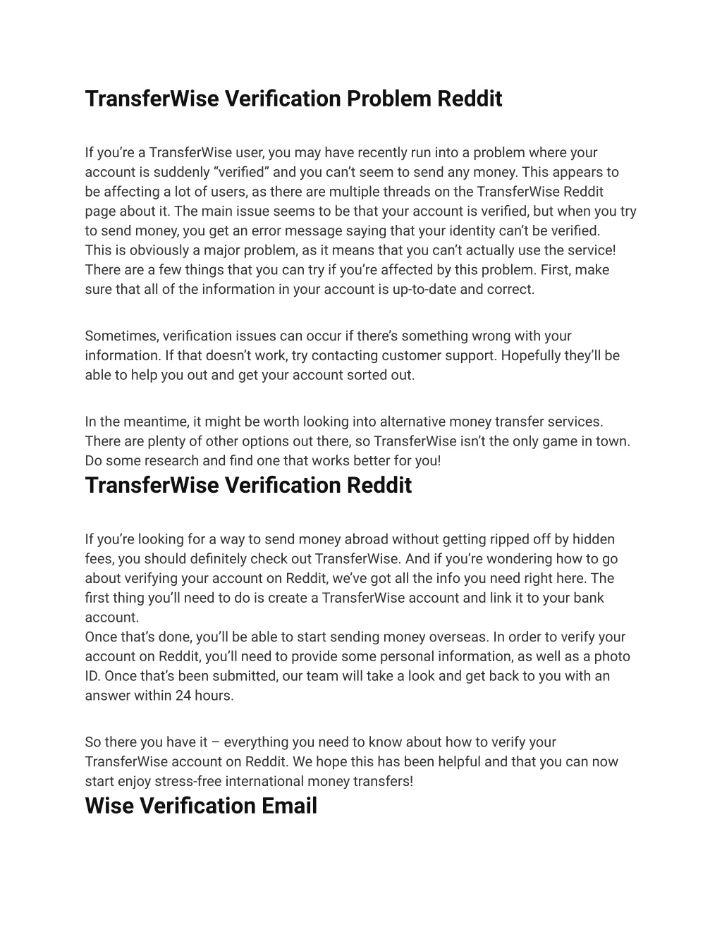TransferWise Verification Problem Reddit If you’re a TransferWise user, you may have recently run into a problem where your account is suddenly “verified” and you can’t seem to send any money. This appears to be affecting a lot of users, as there are multiple threads on the TransferWise Reddit page about it. The main issue seems to be that your account is verified, but when you try to send money, you get an error message saying that your identity can’t be verified. This is obviously a major problem, as it means that you can’t actually use the service! There are a few things that you can try if you’re affected by this problem. First, make sure that all of the information in your account is up-to-date and correct. Sometimes, verification issues can occur if there’s something wrong with your information. If that doesn’t work, try contacting customer support. Hopefully they’ll be able to help you out and get your account sorted out. In the meantime, it might be worth looking into alternative money transfer services. There are plenty of other options out there, so TransferWise isn’t the only game in town. Do some research and find one that works better for you! TransferWise Verification Reddit If you’re looking for a way to send money abroad without getting ripped off by hidden fees, you should definitely check out TransferWise. And if you’re wondering how to go about verifying your account on Reddit, we’ve got all the info you need right here. The first thing you’ll need to do is create a TransferWise account and link it to your bank account. Once that’s done, you’ll be able to start sending money overseas. In order to verify your account on Reddit, you’ll need to provide some personal information, as well as a photo ID. Once that’s been submitted, our team will take a look and get back to you with an answer within 24 hours. So there you have it – everything you need to know about how to verify your TransferWise account on Reddit. We hope this has been helpful and that you can now start enjoy stress-free international money transfers! Wise Verification Email