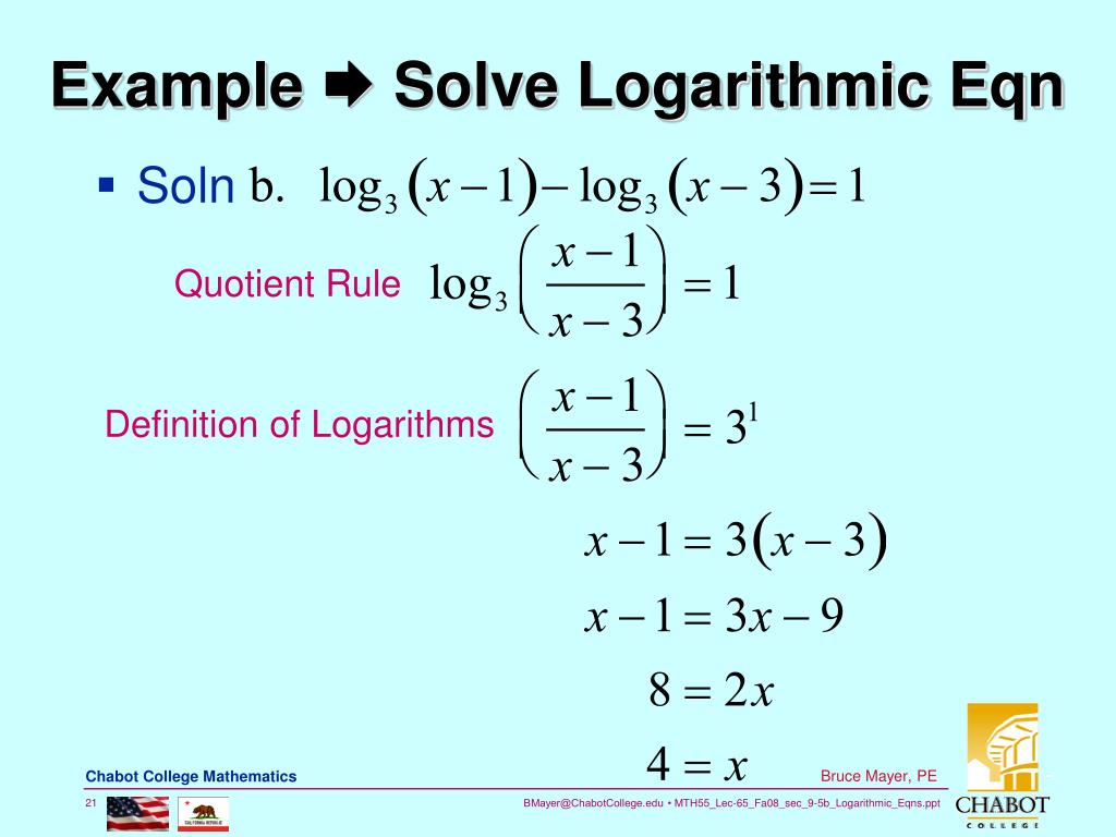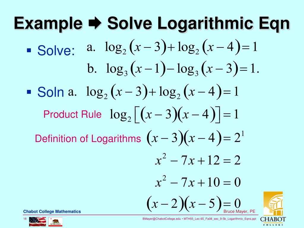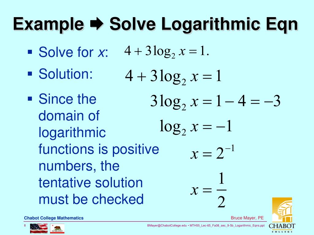 Chabot Mathematics. §9.5b Logarithmic Eqns. Bruce Mayer, PE Licensed Electrical & Mechanical Engineer BMayer@ChabotCollege.edu. MTH 55. 9.5. Review §. Any QUESTIONS About §9.5 → Exponential Equations Any QUESTIONS About HomeWork §9.5 → HW-47. Summary of Log Rules.