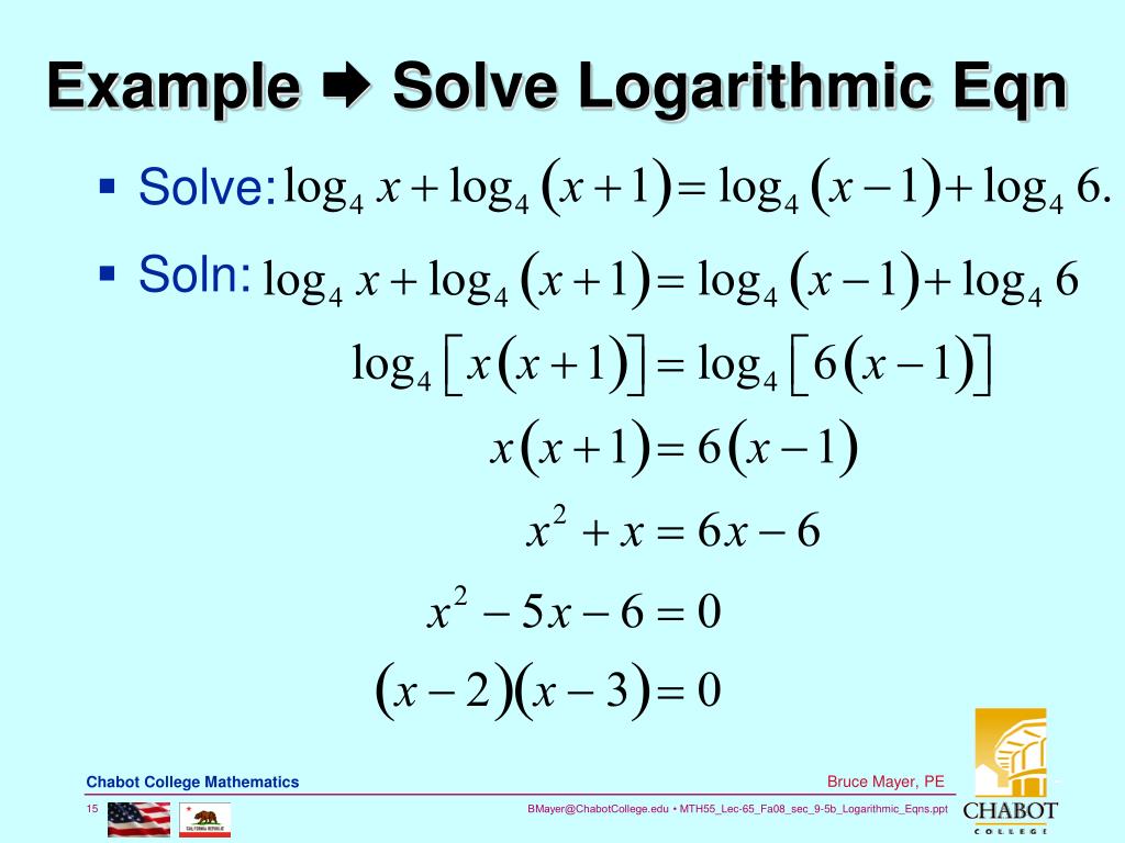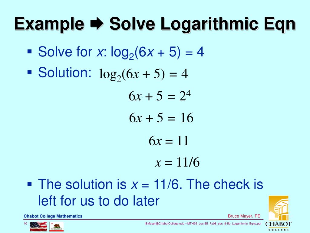 Example Solve Logarithmic Eqn • Solve for x: log2(6x + 5) = 4 • Solution: log2(6x + 5) = 4 6x + 5 = 24 6x + 5 = 16 6x = 11 x = 11/6 • The solution is x = 11/6. The check is left for us to do later