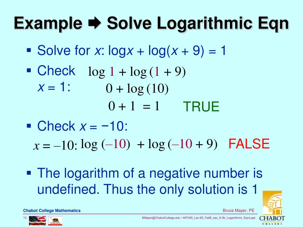 Example Solve Logarithmic Eqn • Solve for x: logx + log(x + 9) = 1 • Check x = 1: log 1 + log(1 + 9) 0 + log(10) 0 + 1 = 1 TRUE • Check x = −10: log (–10) + log(–10 + 9) FALSE x = –10: • The logarithm of a negative number is undefined. Thus the only solution is 1