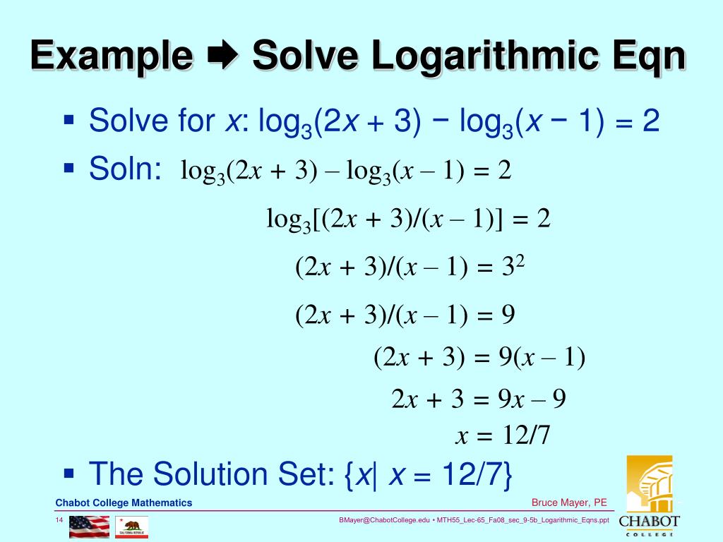 Example Solve Logarithmic Eqn • Solve for x: log3(2x + 3) − log3(x− 1) = 2 • Soln: log3(2x + 3) – log3(x – 1) = 2 log3[(2x + 3)/(x – 1)] = 2 (2x + 3)/(x – 1) = 32 (2x + 3)/(x – 1) = 9 (2x + 3) = 9(x – 1) 2x + 3 = 9x – 9 x = 12/7 • The Solution Set: {x| x = 12/7}