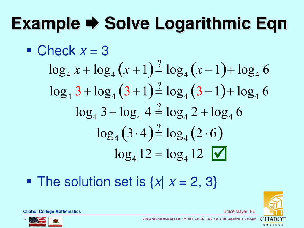 ? ? ? ? Example Solve Logarithmic Eqn • Check x = 3 • The solution set is {x| x = 2, 3}
