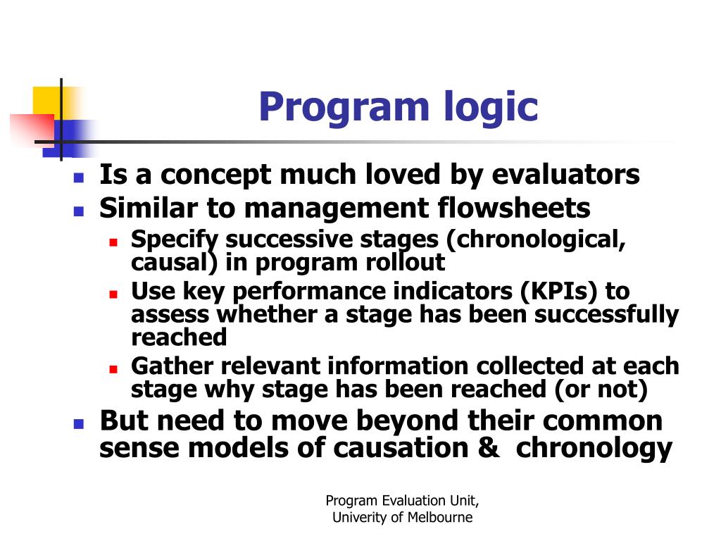 Program logic • Is a concept much loved by evaluators • Similar to management flowsheets • Specify successive stages (chronological, causal) in program rollout • Use key performance indicators (KPIs) to assess whether a stage has been successfully reached • Gather relevant information collected at each stage why stage has been reached (or not) • But need to move beyond their common sense models of causation & chronology Program Evaluation Unit, Univerity of Melbourne