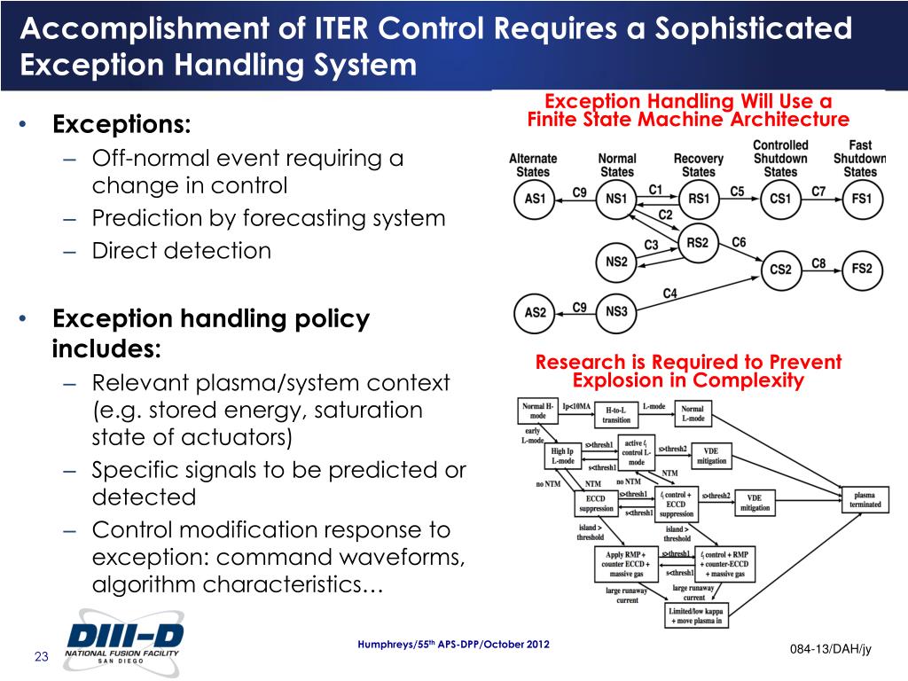 Accomplishment of ITER Control Requires a Sophisticated Exception Handling System Exception Handling Will Use a Finite State Machine Architecture • Exceptions: • Off-normal event requiring a change in control • Prediction by forecasting system • Direct detection • Exception handling policy includes: • Relevant plasma/system context (e.g. stored energy, saturation state of actuators) • Specific signals to be predicted or detected • Control modification response to exception: command waveforms, algorithm characteristics… Research is Required to Prevent Explosion in Complexity 084-13/DAH/jy