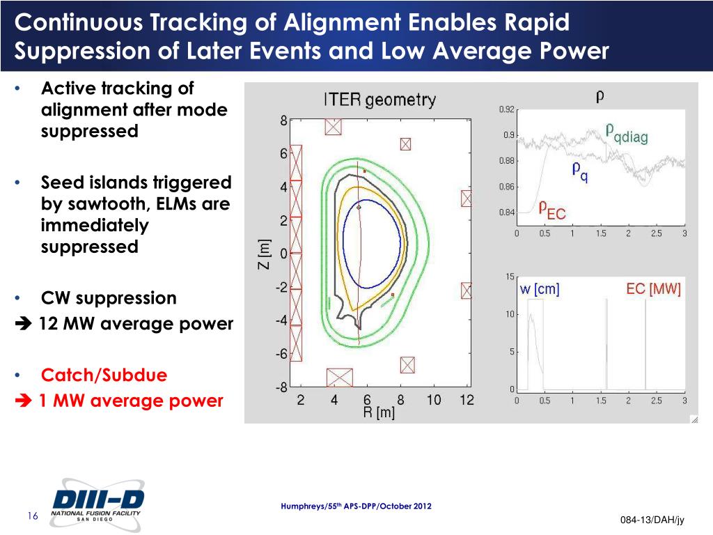 Continuous Tracking of Alignment Enables Rapid Suppression of Later Events and Low Average Power • Active tracking of alignment after mode suppressed • Seed islands triggered by sawtooth, ELMs are immediately suppressed • CW suppression 12 MW average power • Catch/Subdue 1 MW average power 084-13/DAH/jy