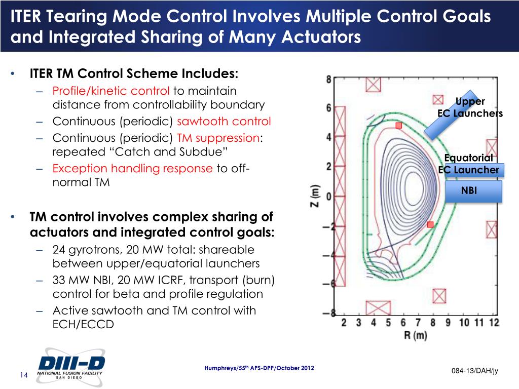 ITER Tearing Mode Control Involves Multiple Control Goals and Integrated Sharing of Many Actuators • ITER TM Control Scheme Includes: • Profile/kinetic control to maintain distance from controllability boundary • Continuous (periodic) sawtooth control • Continuous (periodic) TM suppression: repeated “Catch and Subdue” • Exception handling response to off-normal TM • TM control involves complex sharing of actuators and integrated control goals: • 24 gyrotrons, 20 MW total: shareable between upper/equatorial launchers • 33 MW NBI, 20 MW ICRF, transport (burn) control for beta and profile regulation • Active sawtooth and TM control with ECH/ECCD Upper EC Launchers Equatorial EC Launcher NBI 084-13/DAH/jy