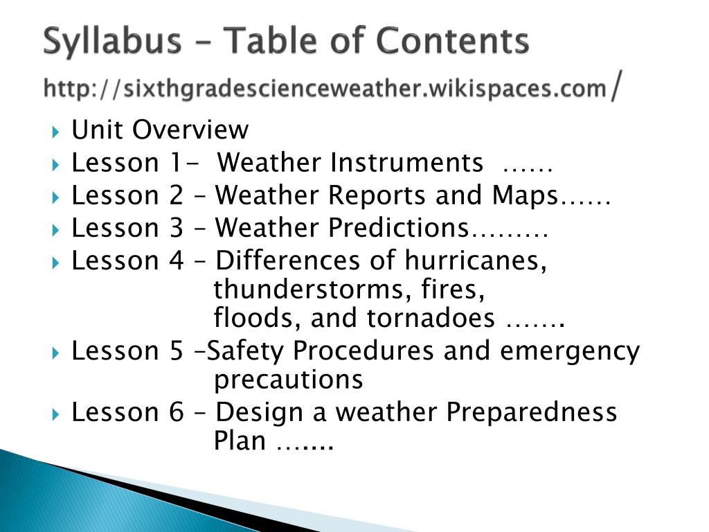 Syllabus – Table of Contentshttp://sixthgradescienceweather.wikispaces.com/ • Unit Overview • Lesson 1- Weather Instruments …… • Lesson 2 – Weather Reports and Maps…… • Lesson 3 – Weather Predictions……… • Lesson 4 – Differences of hurricanes, thunderstorms, fires, floods, and tornadoes ……. • Lesson 5 –Safety Procedures and emergency precautions • Lesson 6 – Design a weather Preparedness Plan …....