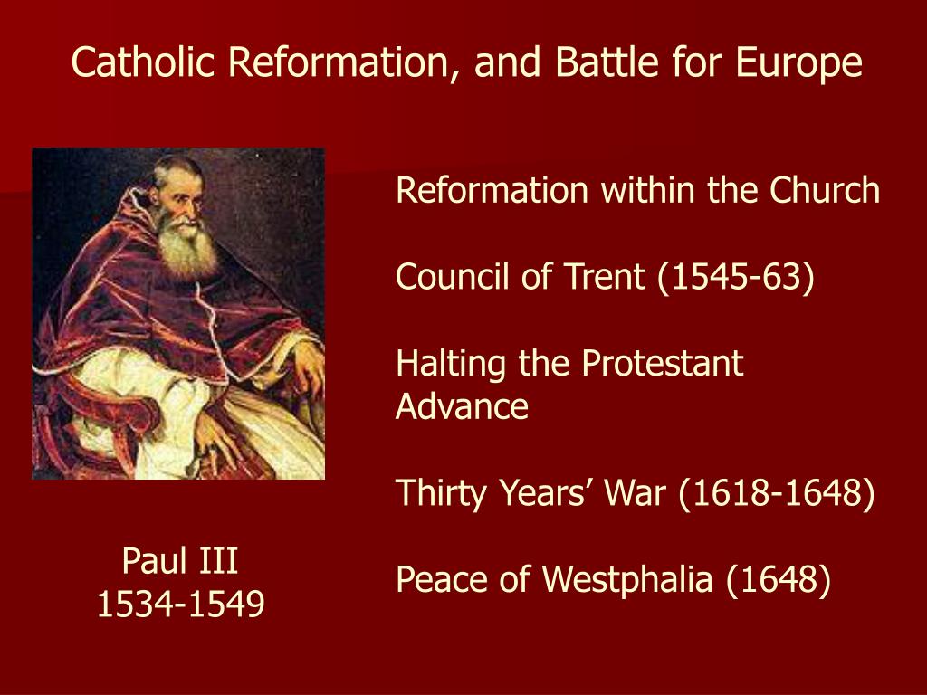 Catholic Reformation, and Battle for Europe Reformation within the Church Council of Trent (1545-63) Halting the Protestant Advance Thirty Years’ War (1618-1648) Peace of Westphalia (1648) Paul III 1534-1549