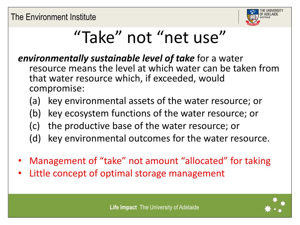 “Take” not “net use” environmentally sustainable level of take for a water resource means the level at which water can be taken from that water resource which, if exceeded, would compromise: (a) key environmental assets of the water resource; or (b) key ecosystem functions of the water resource; or (c) the productive base of the water resource; or (d) key environmental outcomes for the water resource. • Management of “take” not amount “allocated” for taking • Little concept of optimal storage management
