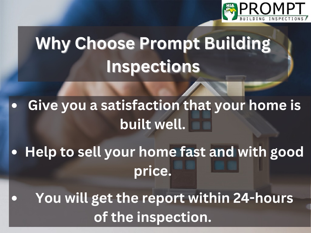 Why Choose Why Choose Prompt Building Prompt Building Inspections Inspections Give you a satisfaction that your home is built well. Help to sell your home fast and with good price. You will get the report within 24-hours of the inspection.