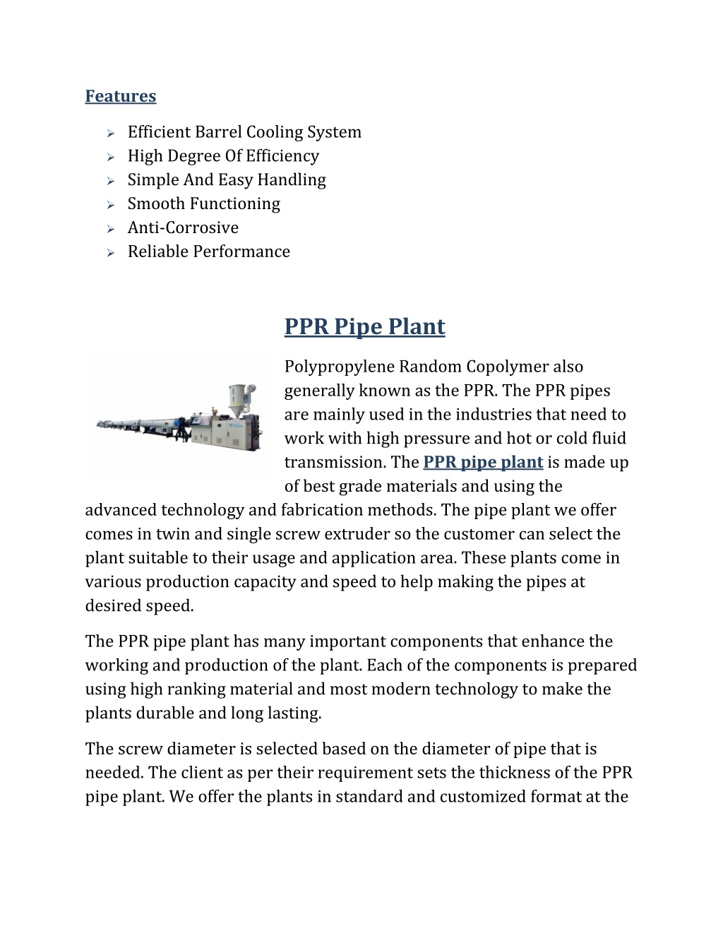 classified in different models as per the production capacity and diameter of the pipe. The RPVC pipe plant is generated in accordance to the quality standards to provide the customer satisfaction. They are designed by the skilled professionals to make them smooth and accurate in dimensions. RPVC stands for rigid polyvinyl chloride. The RPVC pipe plant is fabricated under the supervision of our dexterous professionals that have great experience in the field of manufacturing the pipe plants. We have special departments to handle each and every task from raw material collection to final end product storage. Each of the plant is classified in different models as per the production capacity and diameter of the pipe. The RPVC pipe plant is generated in accordance to the quality standards to provide the customer satisfaction. They are designed by the skilled professionals to make them smooth and accurate in dimensions. The RPVC pipe plants we offer are rigorously prepared under high examination to give flawless performance. These plants are offered in different technical specifications requested by the client. Each of the components is designed with utter care and under the supervision of the experts. The RPVC pipe plant is prepared as per the standard dimensions and features to improve the durability of the pipes. This plant also helps in increasing the production capacity of the industry and also improves the quality. We offer them in standard specifications and even modify them on the request of the client. Features