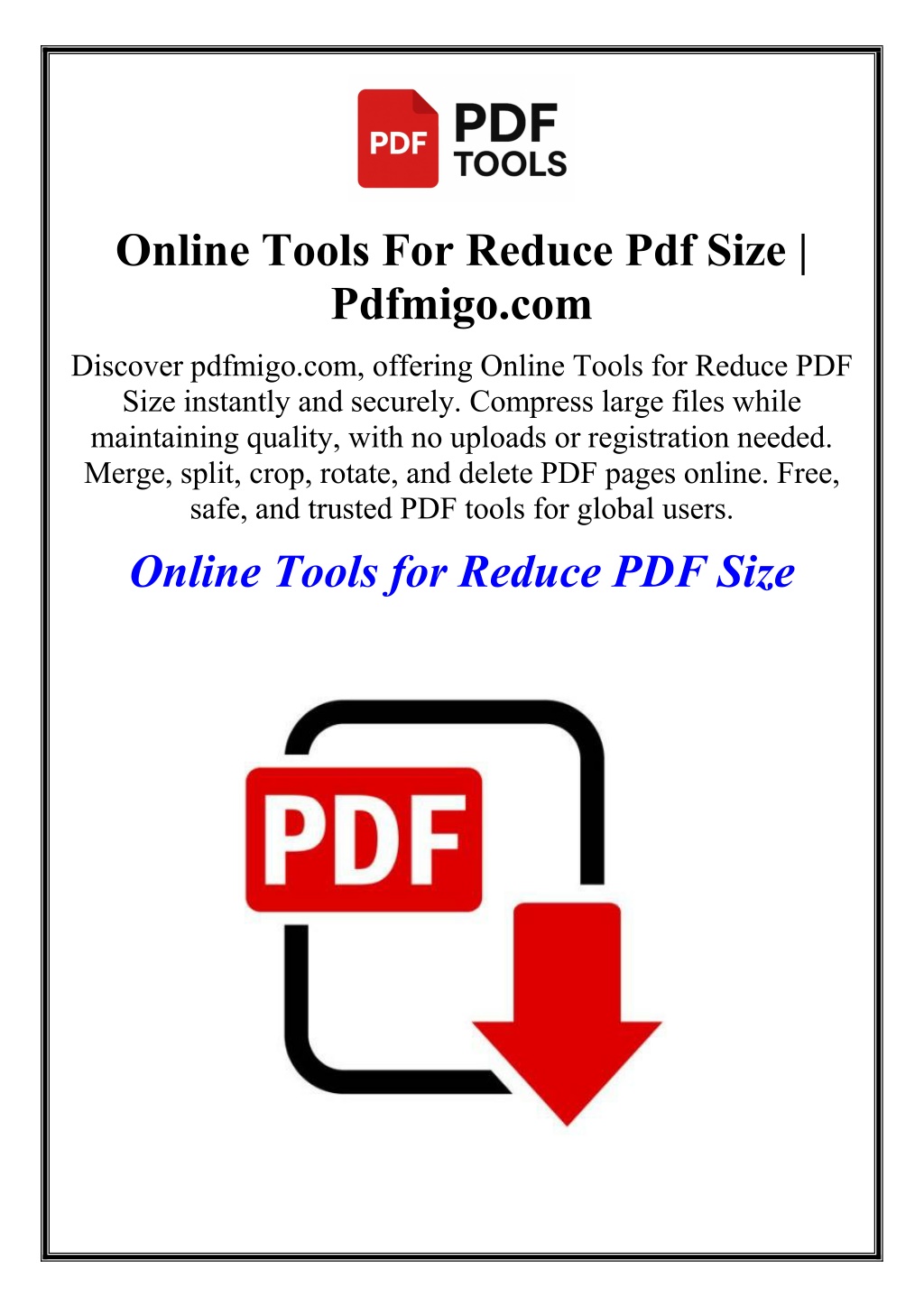 Discover pdfmigo.com, offering Online Tools for Reduce PDF Size instantly and securely. Compress large files while maintaining quality, with no uploads or registration needed. Merge, split, crop, rotate, and delete PDF pages online. Free, safe, and trusted PDF tools for global users.<br><br>https://pdfmigo.com/