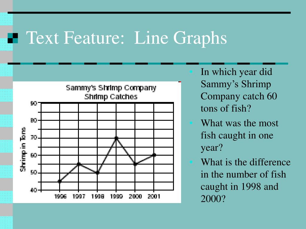 In which year did Sammy’s Shrimp Company catch 60 tons of fish? What was the most fish caught in one year? What is the difference in the number of fish caught in 1998 and 2000? Text Feature: Line Graphs