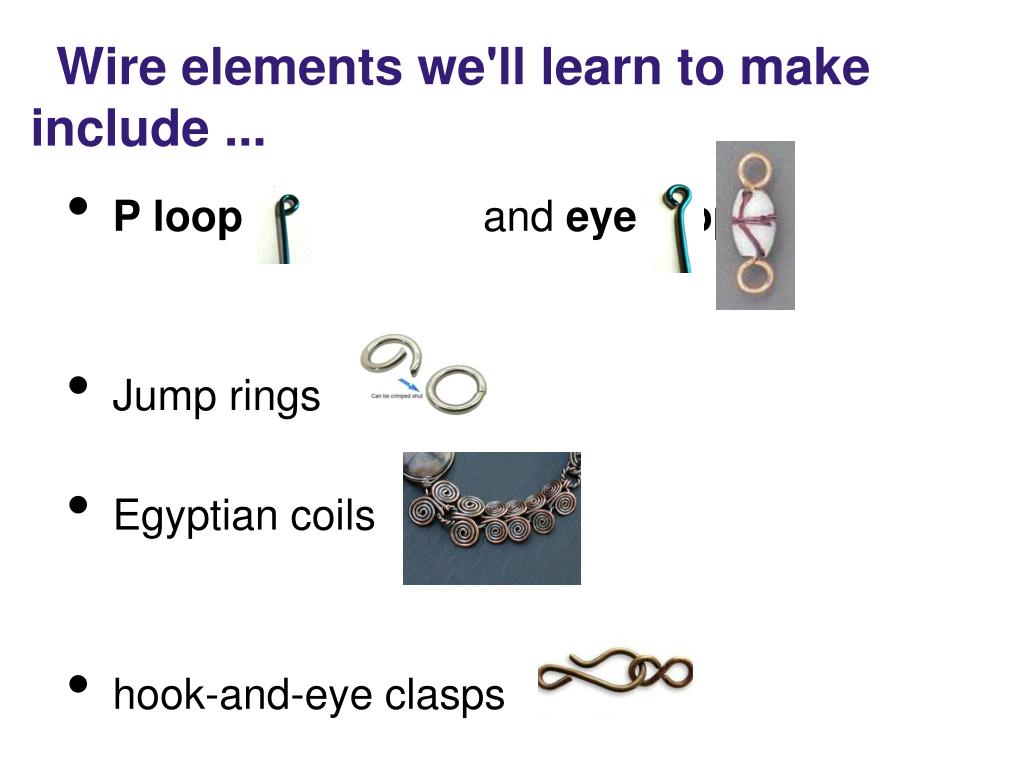 Wire elements we'll learn to make include ... • P loop and eye loop • Jump rings • Egyptian coils • hook-and-eye clasps