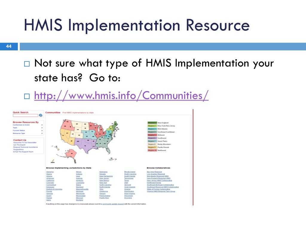 HMIS Implementation Resource • Not sure what type of HMIS Implementation your state has? Go to: • http://www.hmis.info/Communities/