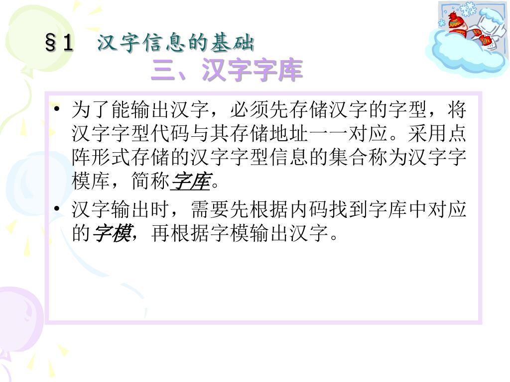§1 汉字信息的基础三、汉字字库 • 为了能输出汉字,必须先存储汉字的字型,将汉字字型代码与其存储地址一一对应。采用点阵形式存储的汉字字型信息的集合称为汉字字模库,简称字库。 • 汉字输出时,需要先根据内码找到字库中对应的字模,再根据字模输出汉字。