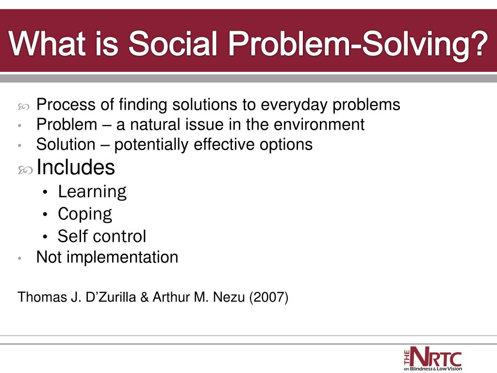 What is Social Problem-Solving? • Process of finding solutions to everyday problems • Problem – a natural issue in the environment • Solution – potentially effective options • Includes • Learning • Coping • Self control • Not implementation Thomas J. D’Zurilla & Arthur M. Nezu (2007)