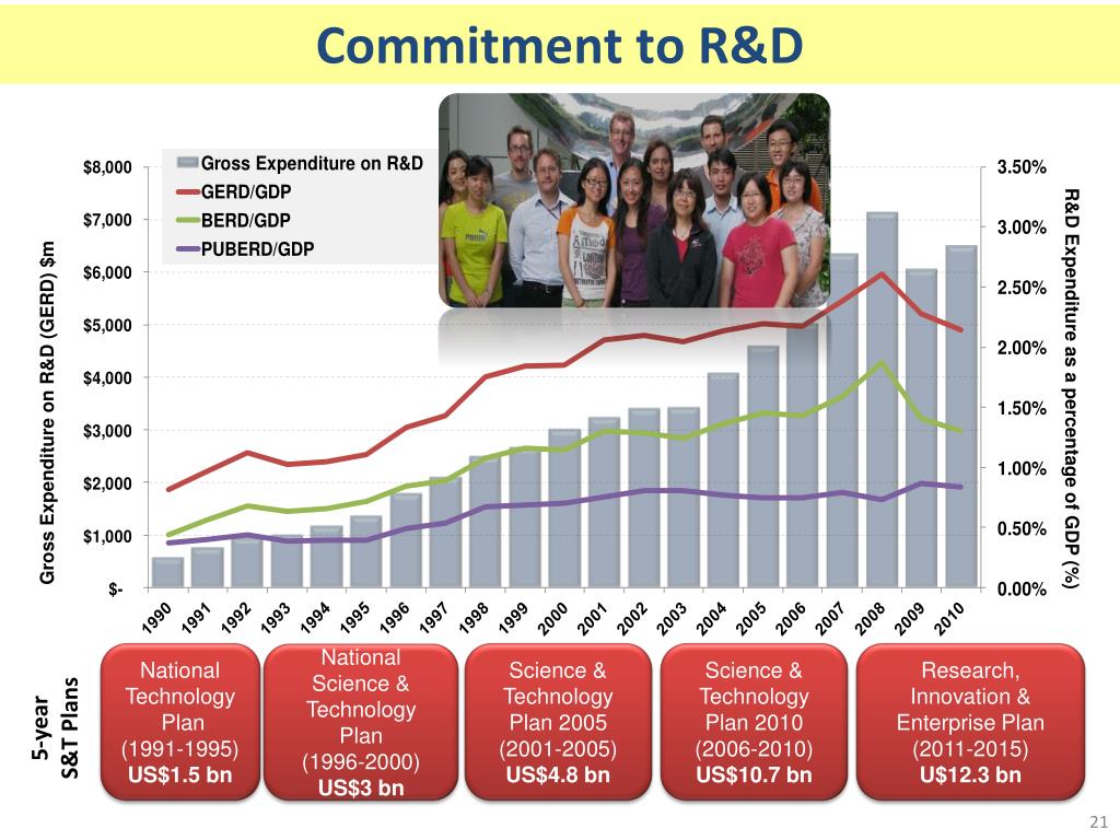 Commitment to R&D R&D Expenditure as a percentage of GDP (%) Gross Expenditure on R&D (GERD) $m National Technology Plan (1991-1995) US$1.5 bn National Science & Technology Plan (1996-2000) US$3 bn Science & Technology Plan 2005 (2001-2005) US$4.8 bn Science & Technology Plan 2010 (2006-2010) US$10.7 bn Research, Innovation & Enterprise Plan (2011-2015) U$12.3 bn 5-year S&T Plans