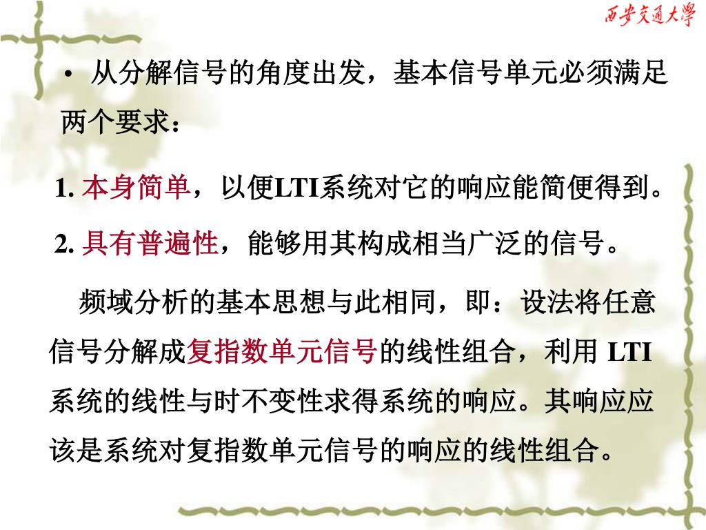 从分解信号的角度出发,基本信号单元必须满足两个要求:从分解信号的角度出发,基本信号单元必须满足两个要求: 1. 本身简单,以便LTI系统对它的响应能简便得到。 2. 具有普遍性,能够用其构成相当广泛的信号。 频域分析的基本思想与此相同,即:设法将任意信号分解成复指数单元信号的线性组合,利用 LTI 系统的线性与时不变性求得系统的响应。其响应应该是系统对复指数单元信号的响应的线性组合。