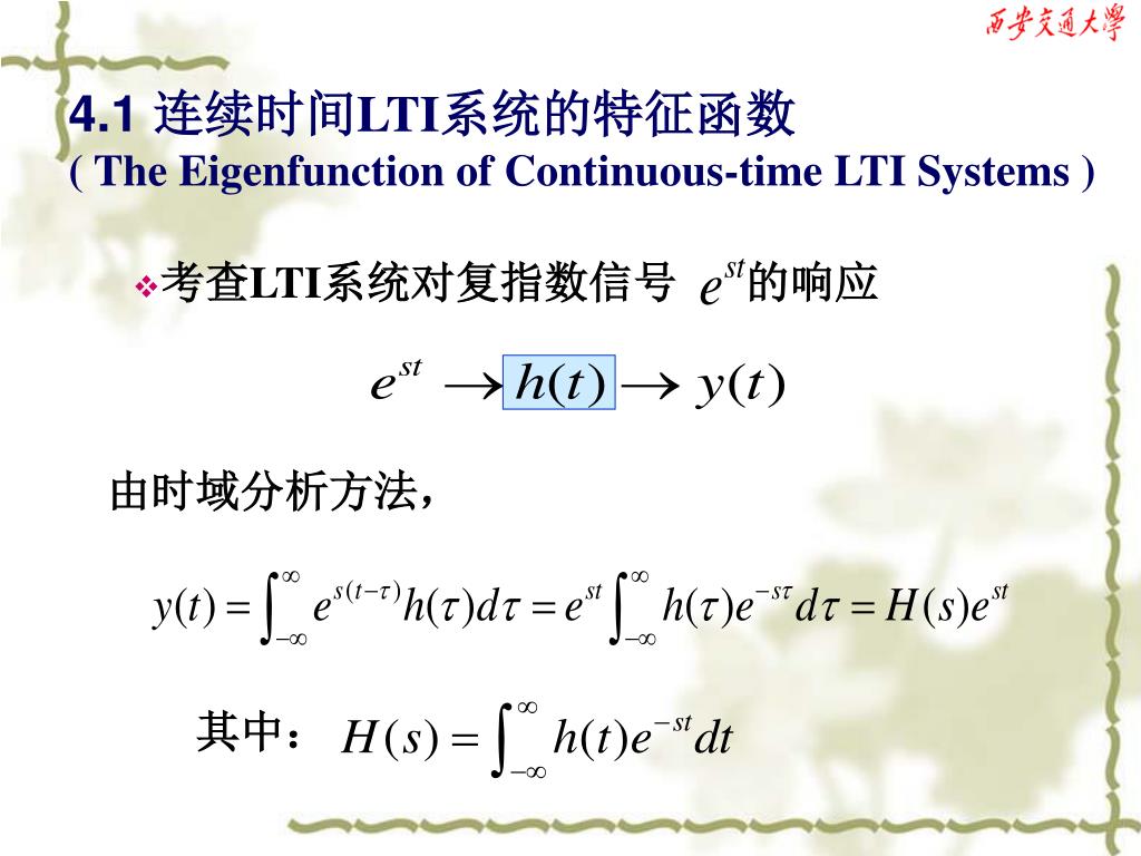 考查LTI系统对复指数信号 的响应 其中: 4.1 连续时间LTI系统的特征函数 ( The Eigenfunction of Continuous-time LTI Systems ) 由时域分析方法,