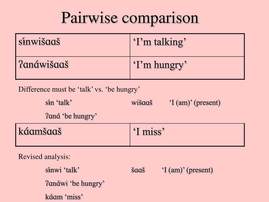 Pairwise comparison Difference must be ‘talk’ vs. ‘be hungry’ sn ‘talk’ wišAAš ‘I (am)’ (present) AnA ‘be hungry’ Revised analysis: snwi ‘talk’ šAAš ‘I (am)’ (present) AnAwi ‘be hungry’ kAAm ‘miss’