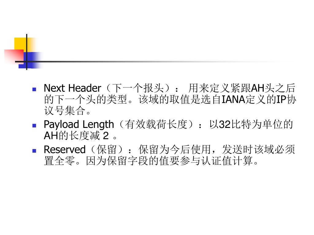 Next Header(下一个报头): 用来定义紧跟AH头之后的下一个头的类型。该域的取值是选自IANA定义的IP协议号集合。 • Payload Length(有效载荷长度):以32比特为单位的AH的长度减 2。 • Reserved(保留):保留为今后使用,发送时该域必须置全零。因为保留字段的值要参与认证值计算。
