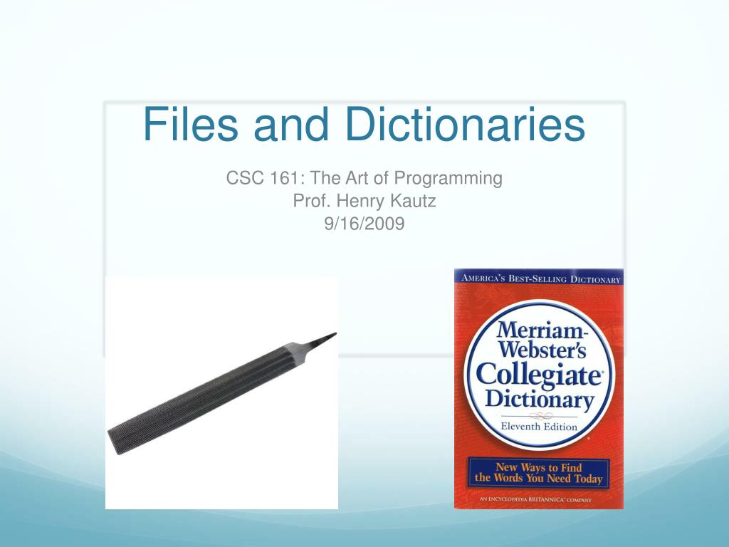Files and Dictionaries. CSC 161: The Art of Programming Prof. Henry Kautz 9/16/2009. Today. Working with files A new data type: Dictionaries Top-down design example. Files. Files can contain ... Text Program Source Code