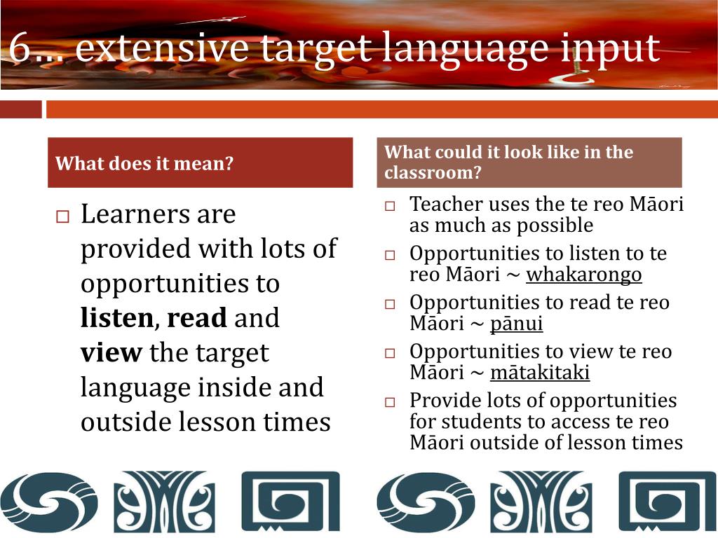 6… extensive target language input What does it mean? What could it look like in the classroom? • Learners are provided with lots of opportunities to listen, read and view the target language inside and outside lesson times • Teacher uses the te reo Māori as much as possible • Opportunities to listen to te reo Māori ~ whakarongo • Opportunities to read te reo Māori ~ pānui • Opportunities to view te reo Māori ~ mātakitaki • Provide lots of opportunities for students to access te reo Māori outside of lesson times