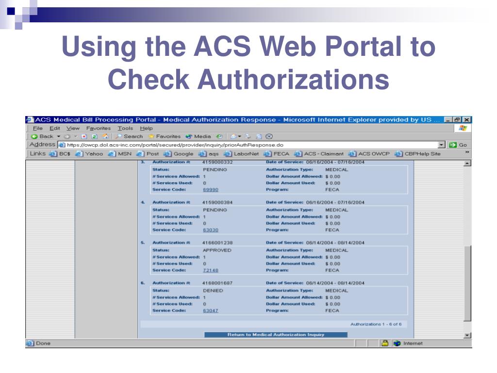 Using the ACS Web Portal to Check Authorizations • Enables users to check authorization status without calling ACS • Limit the number of authorizations returned by entering dates of service range