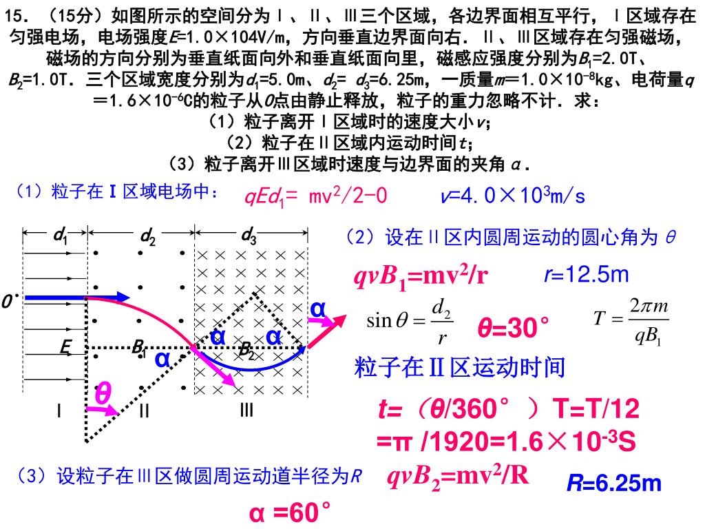 15.(15分)如图所示的空间分为Ⅰ、Ⅱ、Ⅲ三个区域,各边界面相互平行,Ⅰ区域存在匀强电场,电场强度E=1.0×104V/m,方向垂直边界面向右.Ⅱ、Ⅲ区域存在匀强磁场,磁场的方向分别为垂直纸面向外和垂直纸面向里,磁感应强度分别为B1=2.0T、B2=1.0T.三个区域宽度分别为d1=5.0m、d2= d3=6.25m,一质量m=1.0×10-8kg、电荷量q=1.6×10-6C的粒子从O点由静止释放,粒子的重力忽略不计.求: (1)粒子离开Ⅰ区域时的速度大小v; (2)粒子在Ⅱ区域内运动时间t; (3)粒子离开Ⅲ区域时速度与边界面的夹角α. d1 d3 d2 · O E B1 B2 Ⅲ Ⅰ Ⅱ (1)粒子在Ⅰ区域电场中: qEd1= mv2/2-0 v=4.0×103m/s (2)设在Ⅱ区内圆周运动的圆心角为θ qvB1=mv2/r r=12.5m α θ=30° α α α 粒子在Ⅱ区运动时间 θ t=(θ/360°)T=T/12 =π /1920=1.6×10-3S qvB2=mv2/R (3)设粒子在Ⅲ区做圆周运动道半径为R R=6.25m α =60°