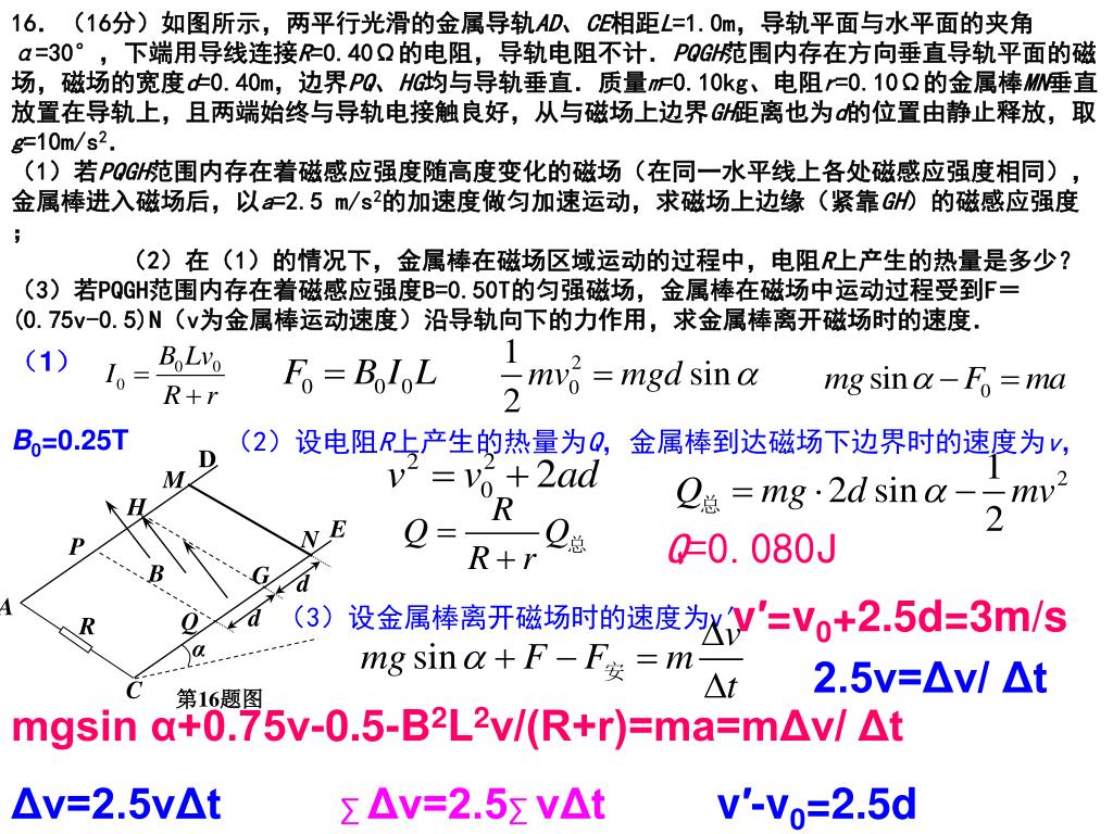 16.(16分)如图所示,两平行光滑的金属导轨AD、CE相距L=1.0m,导轨平面与水平面的夹角α=30°,下端用导线连接R=0.40Ω的电阻,导轨电阻不计.PQGH范围内存在方向垂直导轨平面的磁场,磁场的宽度d=0.40m,边界PQ、HG均与导轨垂直.质量m=0.10kg、电阻r=0.10Ω的金属棒MN垂直放置在导轨上,且两端始终与导轨电接触良好,从与磁场上边界GH距离也为d的位置由静止释放,取g=10m/s2.16.(16分)如图所示,两平行光滑的金属导轨AD、CE相距L=1.0m,导轨平面与水平面的夹角α=30°,下端用导线连接R=0.40Ω的电阻,导轨电阻不计.PQGH范围内存在方向垂直导轨平面的磁场,磁场的宽度d=0.40m,边界PQ、HG均与导轨垂直.质量m=0.10kg、电阻r=0.10Ω的金属棒MN垂直放置在导轨上,且两端始终与导轨电接触良好,从与磁场上边界GH距离也为d的位置由静止释放,取g=10m/s2. (1)若PQGH范围内存在着磁感应强度随高度变化的磁场(在同一水平线上各处磁感应强度相同),金属棒进入磁场后,以a=2.5 m/s2的加速度做匀加速运动,求磁场上边缘(紧靠GH)的磁感应强度; (2)在(1)的情况下,金属棒在磁场区域运动的过程中,电阻R上产生的热量是多少? (3)若PQGH范围内存在着磁感应强度B=0.50T的匀强磁场,金属棒在磁场中运动过程受到F=(0.75v-0.5)N(v为金属棒运动速度)沿导轨向下的力作用,求金属棒离开磁场时的速度. D M H E N P B G d A d Q R α C 第16题图 (1) B0=0.25T (2)设电阻R上产生的热量为Q,金属棒到达磁场下边界时的速度为v, Q=0.080J (3)设金属棒离开磁场时的速度为v′ v′=v0+2.5d=3m/s 2.5v=Δv/Δt mgsin α+0.75v-0.5-B2L2v/(R+r)=ma=mΔv/ Δt Δv=2.5vΔt ∑Δv=2.5∑vΔt v′-v0=2.5d