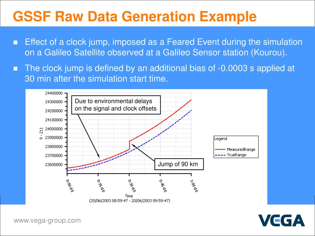 GSSF Raw Data GenerationExample • Effect of a clock jump, imposed as a Feared Event during the simulation on a Galileo Satellite observed at a Galileo Sensor station (Kourou). • The clock jump is defined by an additional bias of -0.0003 s applied at30 min after the simulation start time. Due to environmental delays on the signal and clock offsets Jump of 90 km