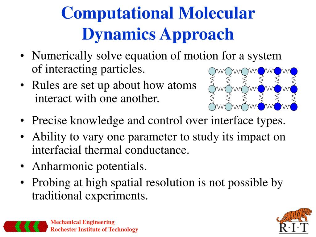 Computational Molecular Dynamics Approach • Numerically solve equation of motion for a system of interacting particles. • Rules are set up about how atoms interact with one another. • Precise knowledge and control over interface types. • Ability to vary one parameter to study its impact on interfacial thermal conductance. • Anharmonic potentials. • Probing at high spatial resolution is not possible by traditional experiments.