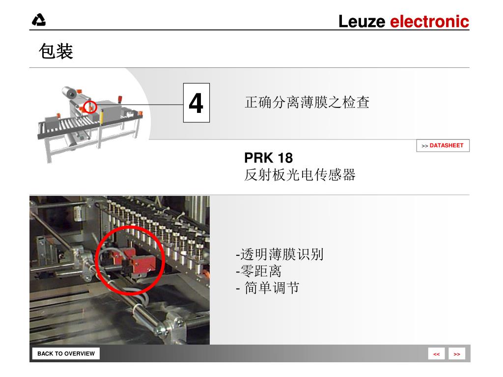 包装 4 正确分离薄膜之检查 >> DATASHEET PRK 18反射板光电传感器 • 透明薄膜识别 • 零距离 • - 简单调节 BACK TO OVERVIEW << >>