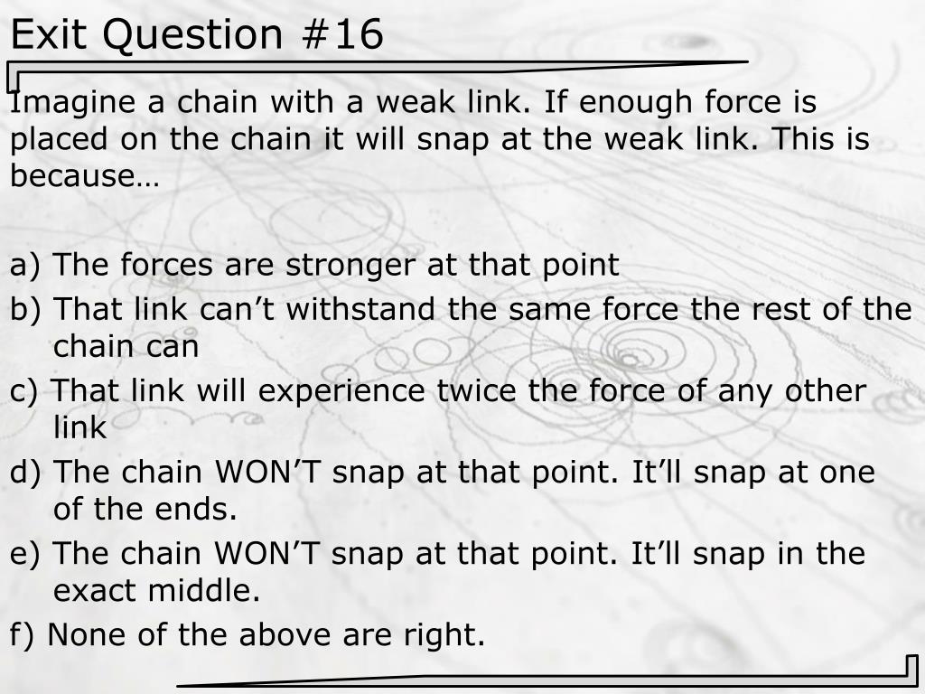 Exit Question #16 Imagine a chain with a weak link. If enough force is placed on the chain it will snap at the weak link. This is because… a) The forces are stronger at that point b) That link can’t withstand the same force the rest of the chain can c) That link will experience twice the force of any other link d) The chain WON’T snap at that point. It’ll snap at one of the ends. e) The chain WON’T snap at that point. It’ll snap in the exact middle. f) None of the above are right.