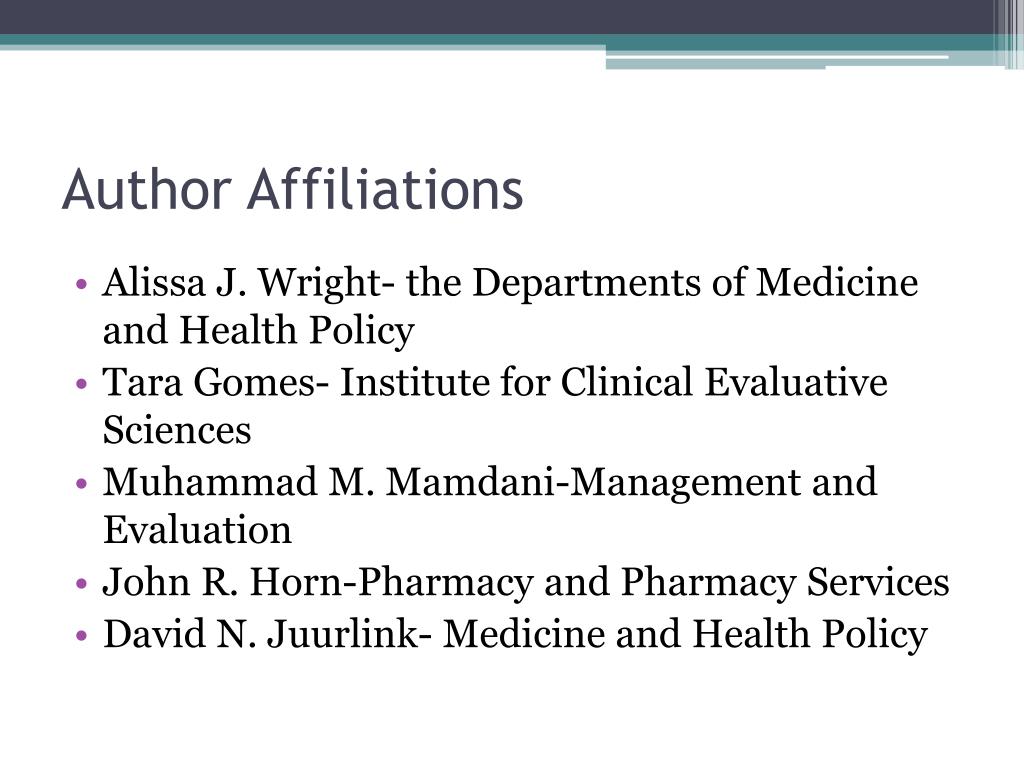 Author Affiliations • Alissa J. Wright- the Departments of Medicine and Health Policy • Tara Gomes- Institute for Clinical Evaluative Sciences • Muhammad M. Mamdani-Management and Evaluation • John R. Horn-Pharmacy and Pharmacy Services • David N. Juurlink-Medicine and Health Policy