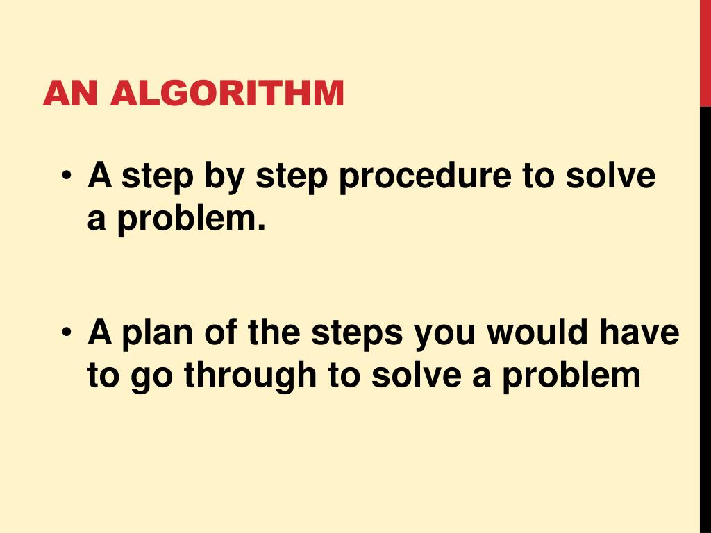 aN algorithm • A step by step procedure to solve a problem. • A plan of the steps you would have to go through to solve a problem