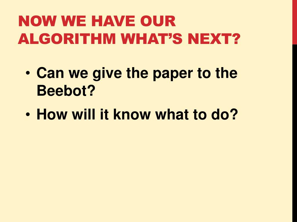 Now we have our algorithm what’s next? • Can we give the paper to the Beebot? • How will it know what to do?
