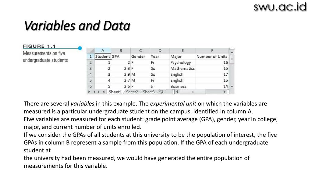 Variables and Data There are several variables in this example. The experimental unit on which the variables are measured is a particular undergraduate student on the campus, identified in column A. Five variables are measured for each student: grade point average (GPA), gender, year in college, major, and current number of units enrolled. If we consider the GPAs of all students at this university to be the population of interest, the five GPAs in column B represent a sample from this population. If the GPA of each undergraduate student at the university had been measured, we would have generated the entire population of measurements for this variable.