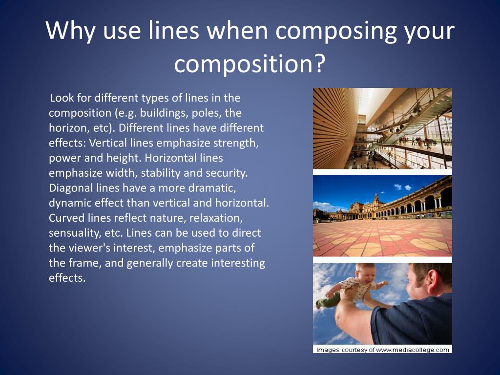 Why use lines when composing your composition? Look for different types of lines in the composition (e.g. buildings, poles, the horizon, etc). Different lines have different effects: Vertical lines emphasize strength, power and height. Horizontal lines emphasize width, stability and security. Diagonal lines have a more dramatic, dynamic effect than vertical and horizontal. Curved lines reflect nature, relaxation, sensuality, etc. Lines can be used to direct the viewer's interest, emphasize parts of the frame, and generally create interesting effects.